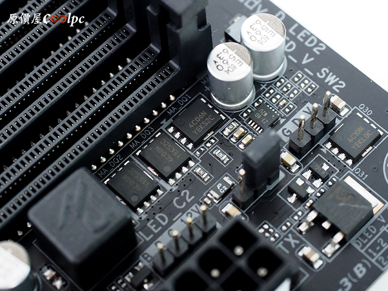 主要的擴充介面部分提供了兩個PCIe x16 插槽,上方具備金屬強化設計的x16 插槽支援Gen3 x16 模式運作,下方黑色插槽則支援Gen3 x4模式運作,中間還有個PCIe Gen3 x1 插槽方便連接介面卡,而在PCIe 插槽之間也可以看到這張主機板配置了兩組M.2 儲存裝置擴充,上方的M.2 插槽支援M Key 2242/2260/2280/22110 長度的PCIe SSD,而中間的M.2 插槽則支援M Key 2242/2260/2280 長度的SATA 及PCIe x4 SSD,另外在電池旁也可以看到配置了一組M.2 WIFI 模組擴充插槽,方便玩家日後選配無線網卡連接使用,不過需要注意的是這裡加裝的M.2 無限網卡要買非CNVi 技術的普通無線網卡,另外再主機板下緣也可以看到同樣配有RGBW 及數位LED 燈條插座。