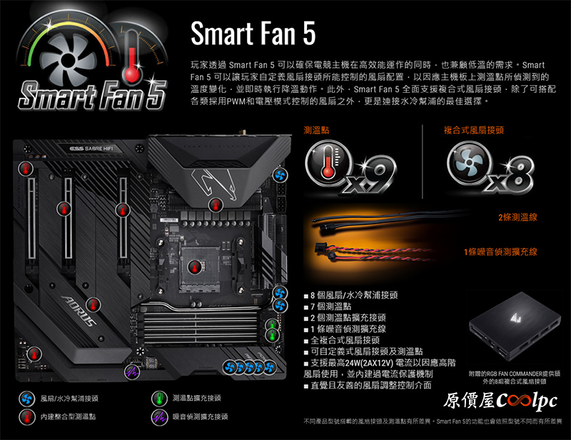 板王可不是隨口說說就算數,這張主機板採用八層板,搭載16相直出infineon 全數位供電設計,搭配每相70A Power Stage 總功率配置可達1120A,就算配上準HEDT 等級16核32執行緒的AMD Ryzen 9 3950X 都不是問題,主機板散熱從Mosfet 區塊打造了超越傳統散熱片300% 散熱面積的Fins-Array 散熱鰭片、直觸式熱導管、高導熱係數導熱墊設計,同時X570 晶片組的散熱設計除了配備獨立風扇也與Mosfet 熱導管連接,使兩者都能保持良好的散熱表現,另外針對整張主機板的散熱也加入了鋁質金屬裝甲、奈米碳塗層散熱底板以及直角連接器設計,優化風流更快帶走元件廢熱,並在高效能的散熱設計上提供了8個風扇、水冷接頭、7個測溫點、2個測溫點擴充及1條噪音偵測線,你沒看錯!這張主機板還能檢測聲壓判斷噪音等級讓玩家能夠更輕鬆的調教達到靜音使用環境。