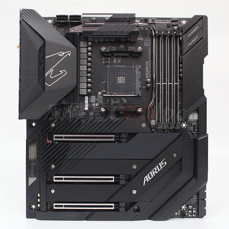 I/O遮罩的設計極其特殊,使用鋁質金屬用料,上頭還有一隻AORUS鷹神LOGO,Mosfet部分使用Fins-Array鰭片散熱,並透過熱導管連接到X570晶片組散熱片,讓MOSFET、CHIPSET能同時受惠!而CPU使用雙8Pin實心Pin針供電設計,還具備裝甲強化!