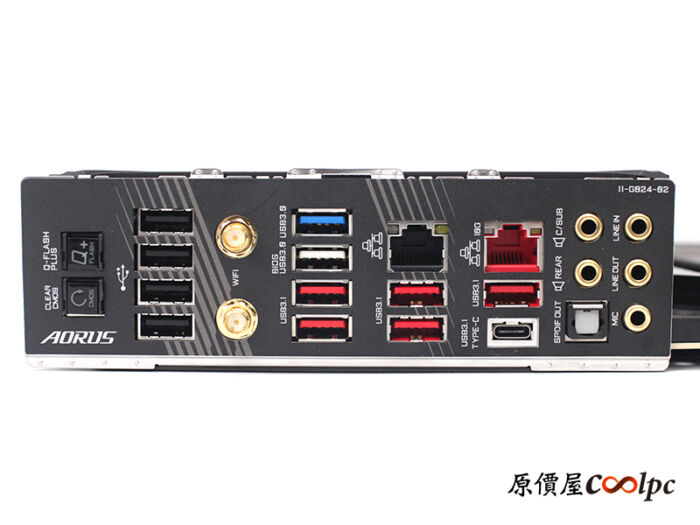 I/O擋板已經預先安裝好,USB方面的資源相當多,而最特殊的是提供了Q-FLASH按鈕以及CLEAR CMOS按鈕,對於專業OC玩家相當友善阿,對於工作站需求及電競玩家更提供了Aquantia 10GbE以及Intel 1GbE雙網路孔設計!無線網路採用最新Wi-Fi 6 802.11ax規格,雙天線設計,鍍金音訊接頭且支援7.1聲道!音質美的冒泡!