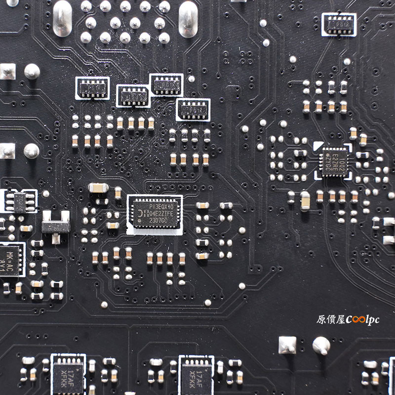 接著是來看看主機板用料囉!拆掉厚實的散熱片可以看到CPU供電相數採用16+1+1 相90A SPS鏡像式電源設計,每相使用Renesas ISL99390 和數顆金屬電容+合金電感,CPU PWM控制器Renesas RAA221320, VCCGT為Renesas RAA220075,VCCAUX則是MP87670晶片,HDMI晶片為IT66318FN和3532GABB、DisplayPort 1.4和USB3.2 Gen2 晶片為TUSB1046A(背面)、USB3.2 Gen2晶片ASM1543、PI3EQX1002E、2 x PI3EQX1004E和PI3EQX2024 ReDriver(部分在背面),USB3.2 Gen1 晶片為GL 3523,Type-C為Realtak RTS5436,2.5GbE Intel i225-V SLNMH晶片,音效晶片為Realtek ALC4080和數顆音效電容組成,背面還有4顆 JYS13008 PCIe 5.0 Redriver 切換器,Wi-Fi 7無線網路晶片為高通QCNCM865 WI-FI 7。