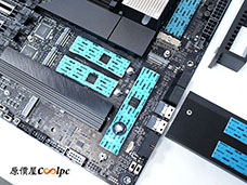 前置 USB I/O 部分提供 USB 20Gbps header(USB-C)、USB 5Gbps header、2 x USB 2.0 headers、microSD card 插槽、M.2 2230 Wi-Fi 擴充插槽,把散熱片卸下可看見 4 x M.2 PCIe 5.0 插槽,可支援 PCIe RAID 0/1/5/10。