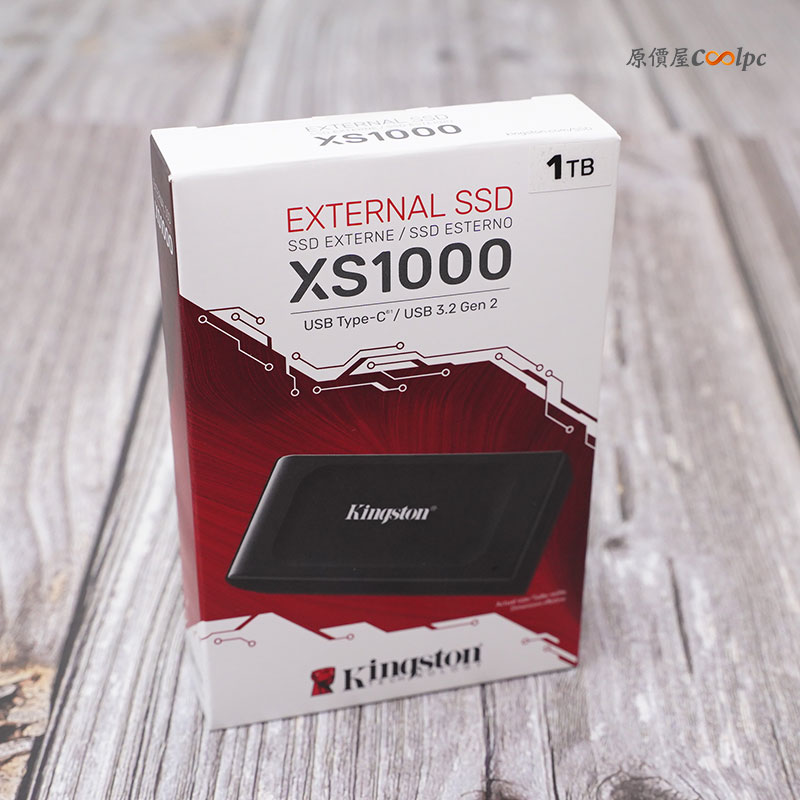 金士頓 XS1000 外接式SSD 外盒採用鮮明的白、紅配色,正中間則是SSD示意圖,右上方則硬碟容量為1TB,採用USB 3.2 Gen2 Type-C 傳輸介面。