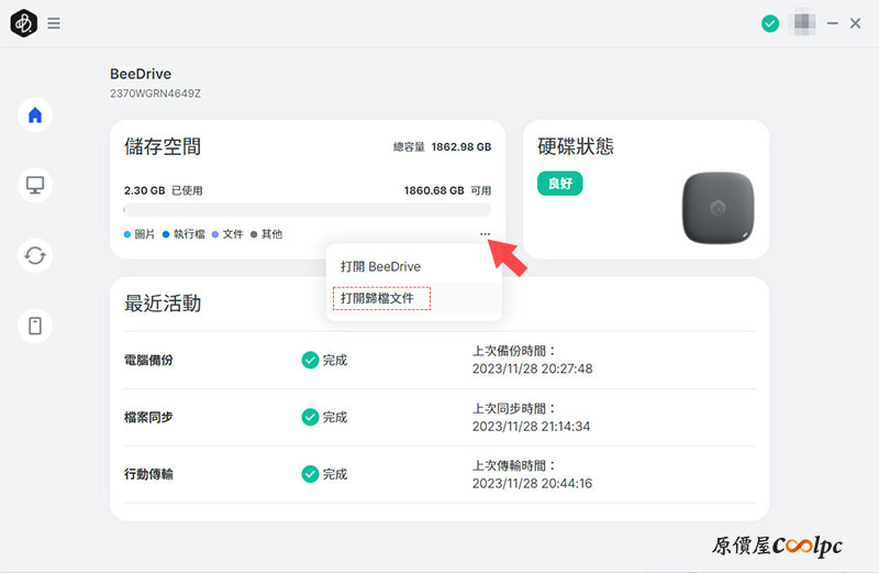 BeeDrive軟體內本身有硬碟健康度和硬碟空間狀況,不需要再另外開軟體就能一目了然!最近活動會顯示備份時間,因為我還沒有設定,所以不會有資訊。