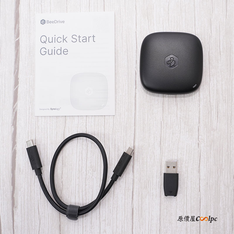 內容物有安裝指南、BeeDrive SSD本體、USB-C to USB -C線材和USB-C轉USB-A接頭。