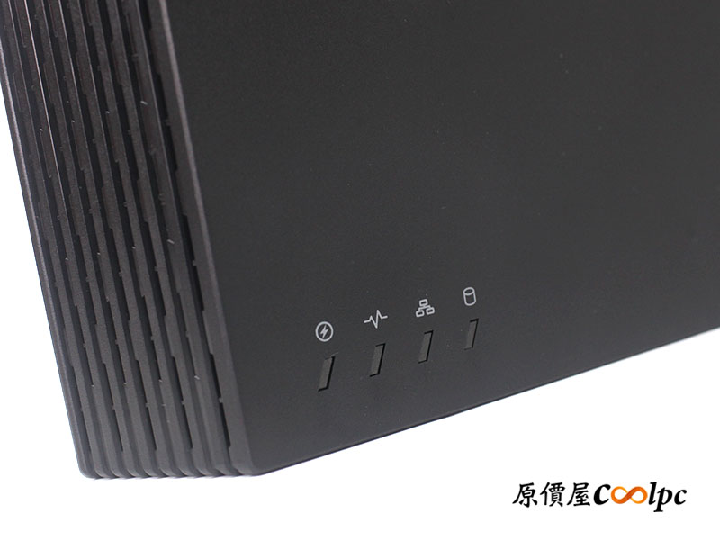 這個表面設計也是很特別,一邊是磨砂質感,另一邊是髮絲紋設計,側邊有大面積散熱孔,主機 POWER 鍵設計在另一端,按鍵整合 POWER LED 外,在周圍還有對稱式的紋路來提升質感,頂端總共 4 顆狀態指示燈,分別是電源、系統狀態、網路、硬碟指示燈,ADSL 那一招被識破…以後偷買 PS 可以跟老婆說這個是 NAS!