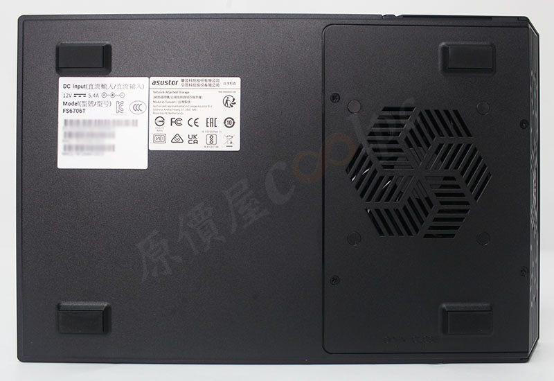 底部可以看見標籤序號貼紙,以及四邊角的防滑腳墊,明顯還有一塊是可卸除的面板,背面藏了一顆 80mm 散熱風扇,提供 M.2 SSD 主動散熱,並帶動整個機器的廢熱流動。