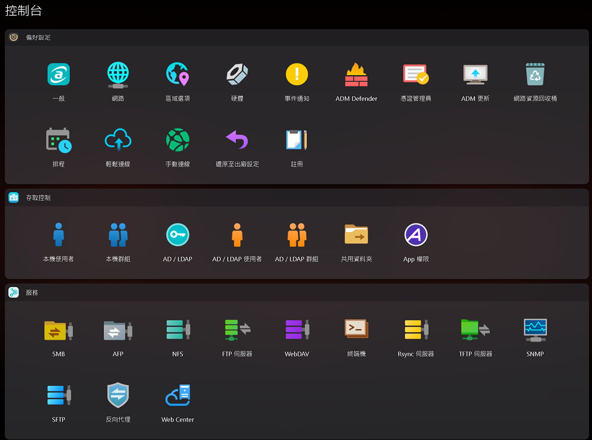 (點圖放大)控制台匯集所有軟硬體設定,共分為偏好設定、存取控制、服務三大項目。