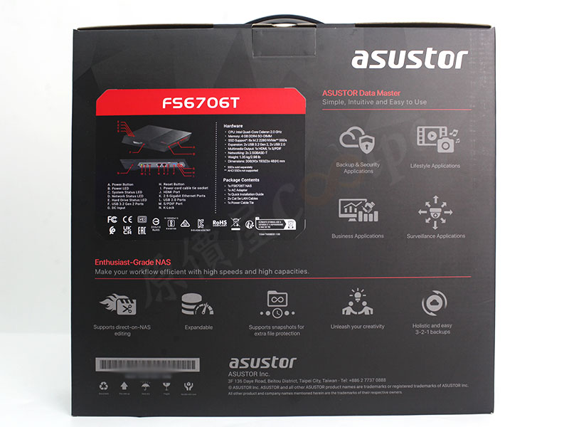 (點小圖放大)asustor FS6707T NAS 包裝設計滿扁的,看正面的示意圖便能知曉這台是 PlayStation…好啦不是~但真的超像 PS4 Slim,從正面的貼紙大致可知曉 FS6706T NAS 的特色,採用 4 核心處理器、I/O提供 2 x USB 10Gbps、2 x 2.5 GbE、S/PDIF 光纖傳輸,以及 6 x M.2 NVMe SSD 擴充,支援 Windows / macOS / Linux 跨平台備份,亦提供 iOS & Android 手機 app 操作。