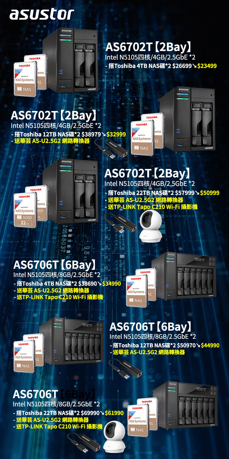 下面就是這次有提供的NAS機種與硬碟組合搭配,NAS從【2Bay】到【6Bay】,硬碟有4TB、8TB、12TB、16TB、22TB的款式,都是直接配兩顆,折價的幅度也從兩千多到七千多不等, 最少的都有9折左右的優惠。部分品項過去我們也有製作過開箱,歡迎有興趣的玩家們參考囉。