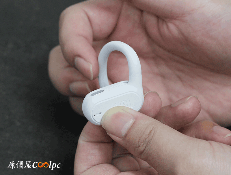 耳機是開放式設計,配戴則是採耳掛式,外側刻上JBL字樣,這裡也是觸控區能夠直接透過指令操作耳機,還有藍色LED指示燈能用來辨識耳機藍牙連線狀況。內部搭載16.2mm大型單體,透過JBL OpenSound Technology提供純淨飽滿的聲音,同時做到接近0漏音表現,還能透過App對耳機進行校調。內建的麥克風也具備ENC通話降噪,透過JBL數位降噪演算法,有效過濾周遭雜訊,提供更清晰的通話體驗。