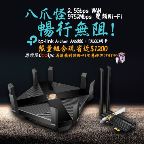 2.5G、5932Mbps雙頻Wi-Fi,八爪怪暢行無阻!TP-Link AX6000&TX50E網卡組合限量優惠!