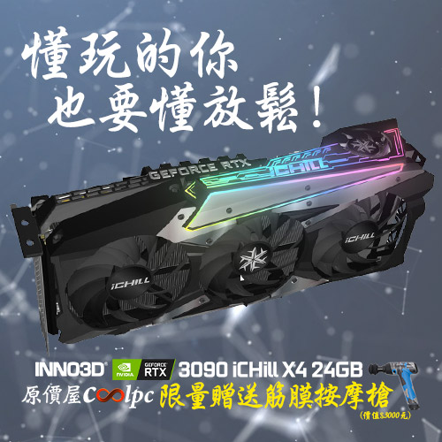懂玩的你也要懂得放鬆!inno3D RTX3090 iChill x4顯示卡,限量送筋膜按摩槍!