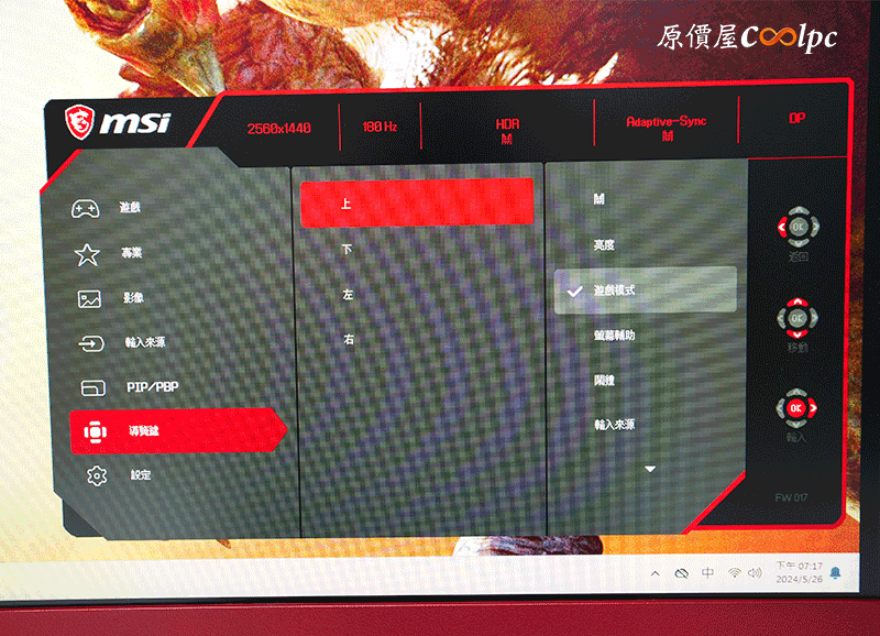 OSD蘑菇頭上下左右功能可編輯,預設往上是遊戲模式,往下是螢幕輔助(準心),往左是KVM,往右則是輸入來源。