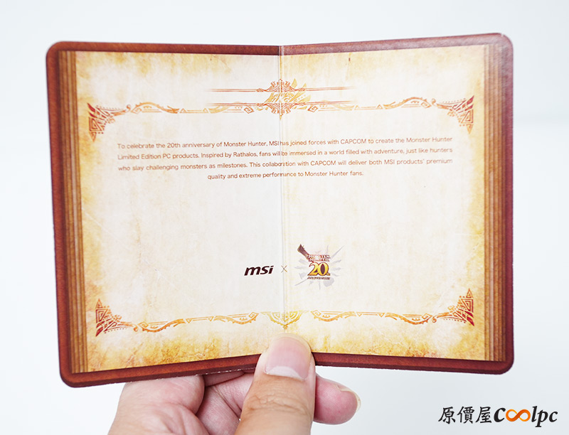 廠商另外附上一張別緻的小卡片,內容大致上是說:為慶祝魔物獵人20周年,微星MSI特別與CAPCOM公司合作,以火龍作為靈感發想,特別設計出這款聯名螢幕,玩家們將會沉浸在冒險中,就如同遊戲中的獵人一般。這次與CAPCOM的合作將展現微星商品的高品質,同時也滿足魔物獵人玩家所需的極致效能。