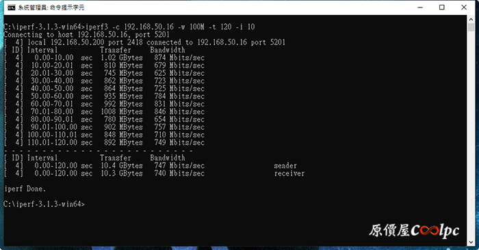最後就進行網路速度的測試吧!利用iperf進行測試,路由器接法為ADSL>HUB>RT-AX92U>PC,透過主路由器接一台PC1,再透過另一台AiMesh配置的副路由器拉一條網路線接在PC2,兩台PC網卡皆為Intel GbE Lan,藉此測試兩台AX92U距離3公尺的狀況下能帶來多快的速度,測試結果平均為747Mbit/sec,而最高還有到874Mbits/sec的數據,有接近GbE Lan的速度,可能中間被甚麼訊號干擾而降速了,畢竟是這是光華地段XD,不過和先前TP-LINK P7那台比起來,的確有比較快唷!