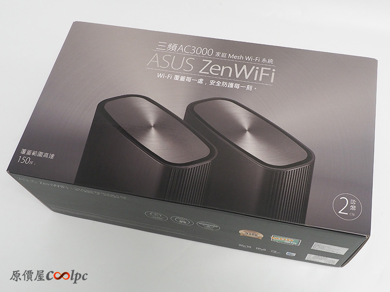 還沒看到本體光從包裝設計及產品形象照就可以發現到這款產品具備華碩招牌的同心圓設計概念走的是高質感的優雅路線,看膩傳統多天線無線分享器的朋友這款美型Mesh WiFi 系統絕對能滿足各位挑剔的審美品味,而在包裝上面上也可以看到這次開箱的版本內建兩台ZenWiFi AC 訊號覆蓋範圍可達150坪。