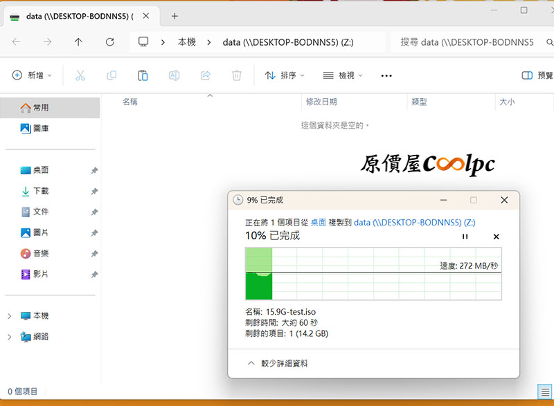 接著測試檔案傳輸,透過網路芳齡傳送 iso 檔案,單檔大小 15.9GB,每秒傳輸約 272MB/s,換算過去約是 2.1Gbps 的傳輸效率,傳個一分鐘差不多就結束了!給創作者存取大型檔案相當有效率!