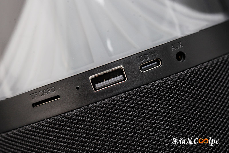 另一面則是輸入介面,具備AUX 3.5mm接孔、DC-IN TYPE-C供電接埠、USB隨身碟接埠,以及能支援micro SD卡的接埠。