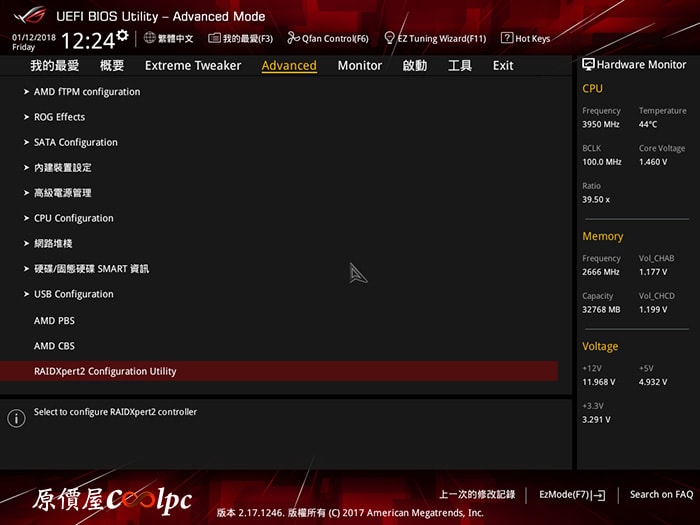 再次進到BIOS Advanced 選項當中可以發現最下方多了個RAIDXper2 Configuration Utility 選項。