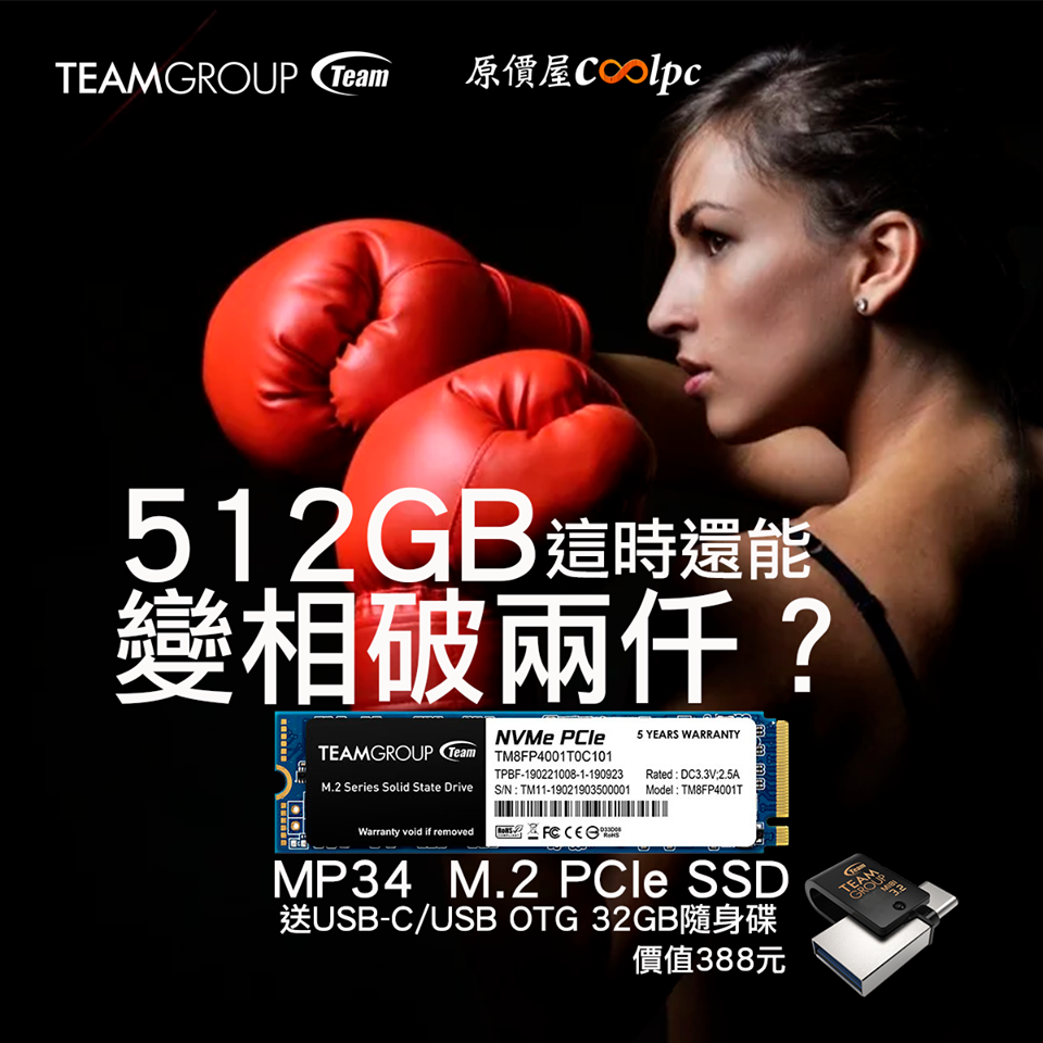 不漲反跌?!十銓MP34 512GB M.2 PCIe SSD送OTG隨身碟!