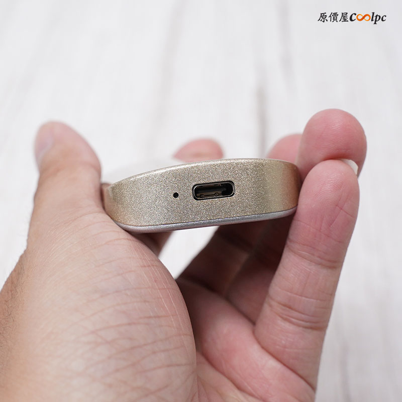 介面規格為USB-C,左邊還有一個圓形的孔,過電會有燈號會有燈恆亮,閃爍代表讀寫中。