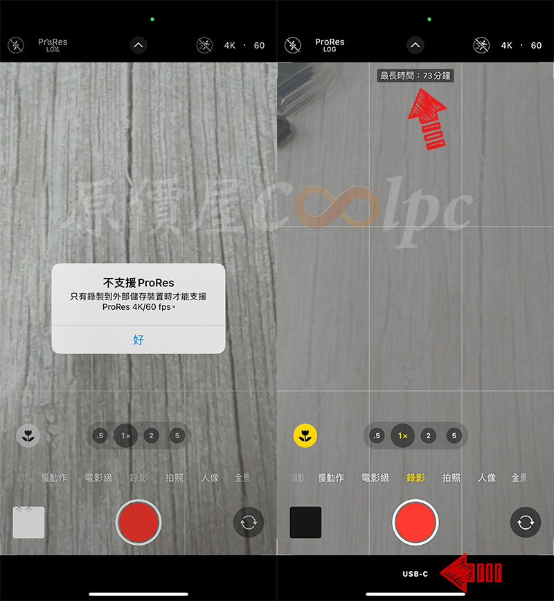 APPLE新的ProRes格式要錄製4K 60 fps 需外接儲存裝置才行,接上SK hynix Beetle X31 1TB外接式SSD 果然可以正常錄影了!下方會顯示USB-C介面,上方則是可以看到1TB的容量可以錄製約一小時又十三分鐘,紀錄日常Vlog也夠用了啦!