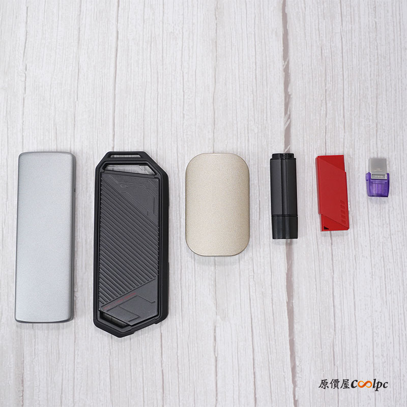 對比一下大小,左邊兩個則是M.2 SSD外接盒,右邊三個則是隨身碟,把SK hynix Beetle X31 1TB外接式SSD把在中間,還真的挺小巧的!