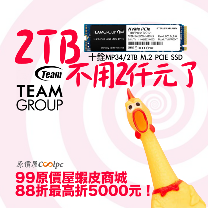 2TB M.2 SSD也破兩仟元了!十銓MP34 2TB有機會再享原價屋蝦皮最高折五仟元?!