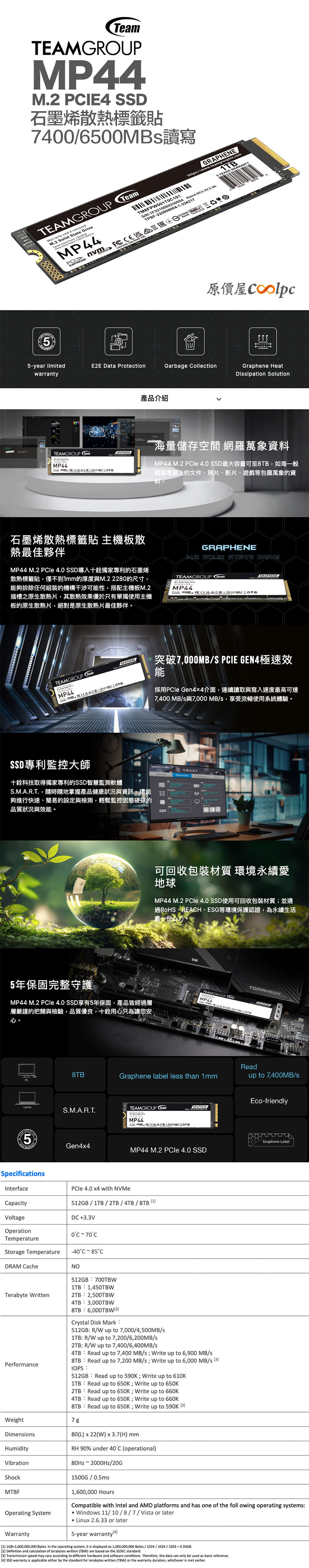 十銓TEAM MP44 1TB M.2 PCIE Gen4 SSD在7000/6500MBs讀寫之下可以不用二千元算是非常超值,畢竟這個級距多數在$2500以上,而$2000以內的就是讀寫減半了。除此之外,MP44還用了石墨烯散熱標籤貼,有助於高速運行時有效散熱,再加上SSD專利監控大師S.M.A.R.T,能隨時掌握產品健康狀況與資訊,增加SSD可靠性和延長使用壽命,所以它也提供了5年保固。十銓TEAM MP44 1TB M.2 PCI Gen 4 SSD其實原來定價就接近兩千,之前也曾做過促銷兩千元以下,一下子數百條就賣光了,現在再來一次,各位萬萬別錯過哩~