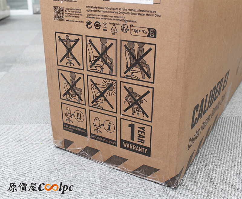 酷碼CALIBER E1採用米色紙箱包裝,封面有椅子簡圖及名稱並且押上酷碼LOGO。箱子體積不算大,搬運也會相對容易一些。