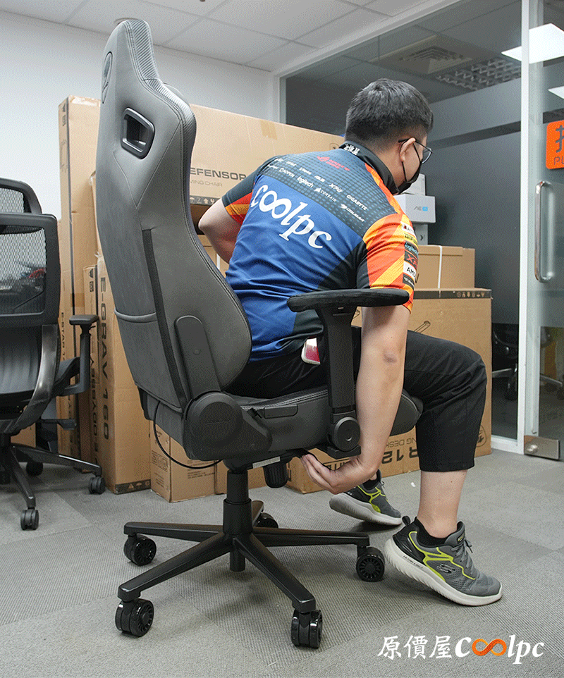 本體登場!必須說DEFENSOR S JET GRAY F這顏色我很喜歡,搭配本身仿賽車椅的設計,整體而言非常有型。椅身具備符合人體工學的曲線,面料使用觸感、耐磨度、透氣度都更好的類皮紋科技布,帶來更貼近真皮的觸感,內部則是高密度成型泡棉提供良好支撐力,再搭配椅子靈活的機構設計將舒適度推上頂峰,接著就讓我們來一一細看。