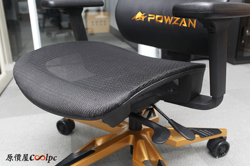 腰靠是弧面設計更符合人體工學,上面也有金色車縫的POWZAN字樣。