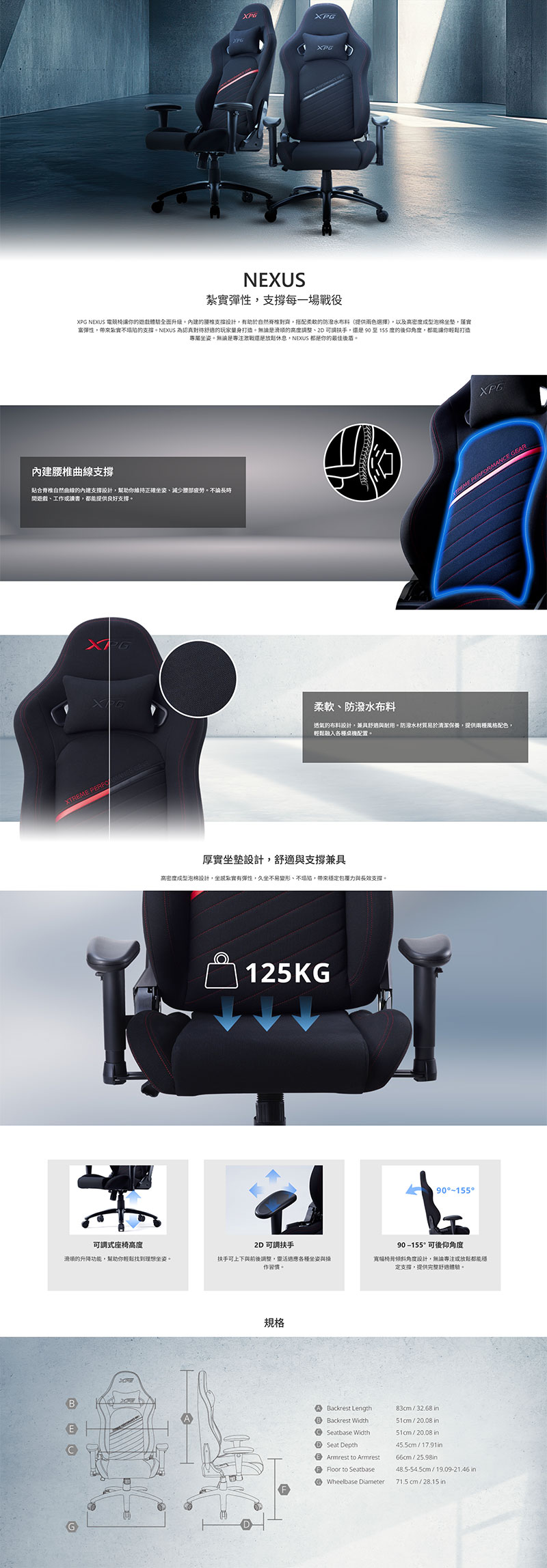 這次主角「XPG NEXUS / NEXUS PLUS 」是專為長時間戰鬥的玩家打造的專業電競椅。擁有人體工學支撐設計,符合脊椎曲線,從頭到腰給你滿滿的支撐感,玩再久也不會變成鐘樓怪人XD。另外還有 4D 扶手(NEXUS 為 2D 扶手)的配置,讓你輕鬆調整前後、左右、上下的角度,想放輕鬆還是呈現備戰狀態都能穩穩配合。而多段式的後仰結構也讓你能自由的切換調整為 90° 專注開戰、155° 放鬆耍廢模式,你只需輕輕的一拉!就能改變你現在的乘坐狀態。另外也加入了高密度的泡棉坐墊,柔軟且不塌陷,彈性回饋也讓你每一坐都是 VIP 等級的享受!最後還有金屬五爪底座與高承重氣壓棒為基底,最高承重 125kg 的實力,讓你坐起來就是穩如戰車,不怕長時間戰鬥以及戰況激烈帶來的久坐不安感。當然這次兩款電競椅在椅面材質上也有不同,「XPG NEXUS」為柔軟的防潑水布料,而「XPG NEXUS PLUS」更是使用了質感皮革料來做包覆。後者也有更進一步的升級,用料厚實、支撐也更全面~就看各位玩家追求的是什麼了。快趁這次新品上市活動給它買起來~限量「XPG 抱枕毯+威剛外接式 SSD SC750 1TB」超值雙好禮送完就沒有囉!