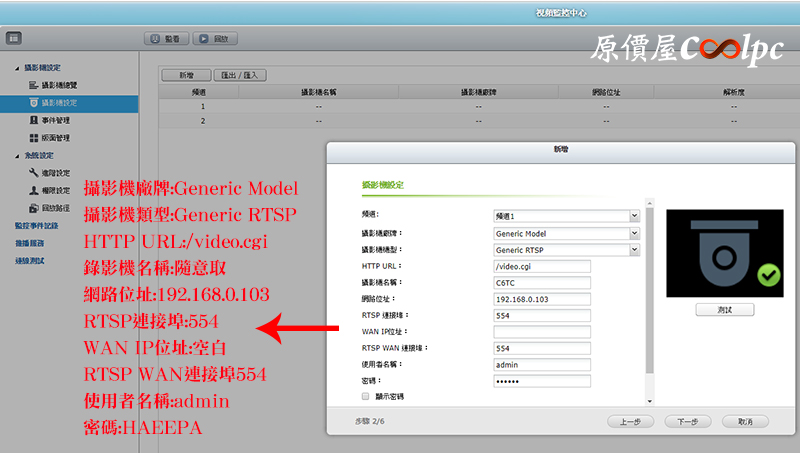 QNAP威聯通也一樣,比較不同的就是M-JPEG設定,要在HTTP URL要輸入/video.cgi,其他設定可與圖中描述一模一樣即可。