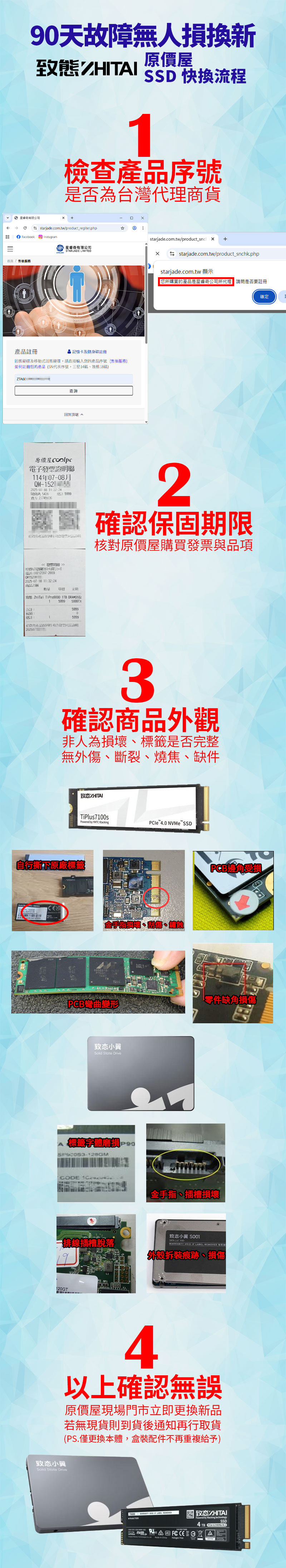 「原價屋 x 致態 ZHITAI 固態硬碟快換中心成立!」只要是在原價屋購買的致態固態硬碟,90 天內故障非人損壞,均可拿到全台原價屋門市,外觀檢測通過就直接換新!流程簡單又快速,且不影響原有的保固,就是多一個快速便利管道能夠換新服務,讓各位買的安心、用的放心。所以 90 天內盡情使用,把商品價值發揮到極致,只要非自行拆解、亂拆裝等人為因素,硬碟讀取不到,我們將負責拿全新品跟您交換!外觀人損標準則皆以現場判定為主,恕無法以照片來做辨識。