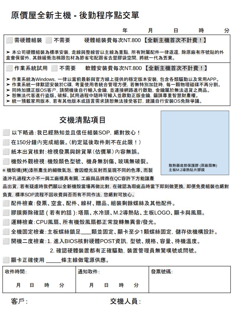 *為盡量減少材積,凡組裝過後的主機,無序號之產品空盒則不會附上(ex:硬碟之空盒,板卡內包材..),如有需要附回請跟網路專員告知備註即可。