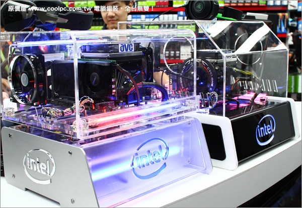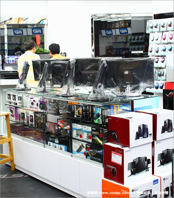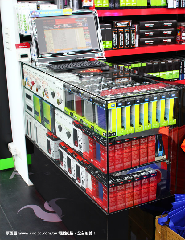 大門口電競遊戲區後方有個展台,為大家擺出來幾部液晶顯示器, 其下櫃內則有散熱器、音效卡與行車紀錄器。