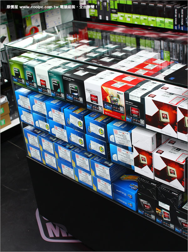入口右邊櫃台,華碩、技嘉、微星、華擎、精英主機板在後面陳列架上,櫃內則滿是記憶體與SSD。