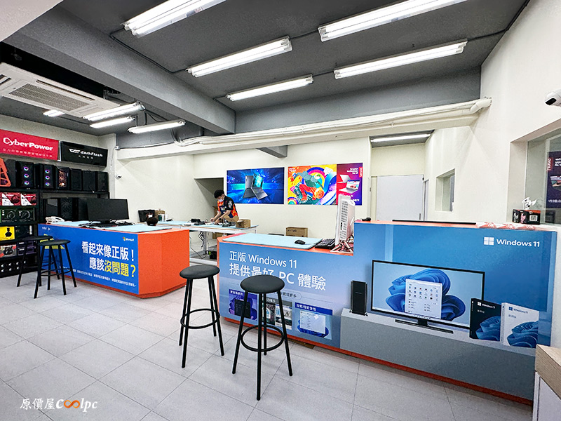穿過前棟來到原價屋宜蘭新民店後棟。這裡的空間也相當大,規劃為前方ROG加羅技電競週邊展示區、左方組裝電腦估價區,右邊為ACER、ASUS筆電展示區,後方工程組裝維修測試區,中間為等待區備有電競椅試坐。