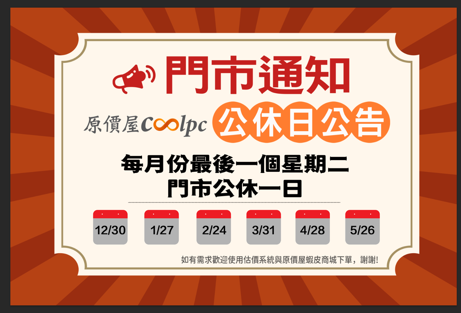 本年度起,原價屋每月新增多一個公休日,排定時間與光華商場相同,皆為每個月最後一個星期二,實體通路公休一日不營業,惟虛擬通路無休仍正常運作,造成不便之處請見諒,有需求也歡迎多加利用原價屋線上估價系統原價屋蝦皮商城下單,謝謝。