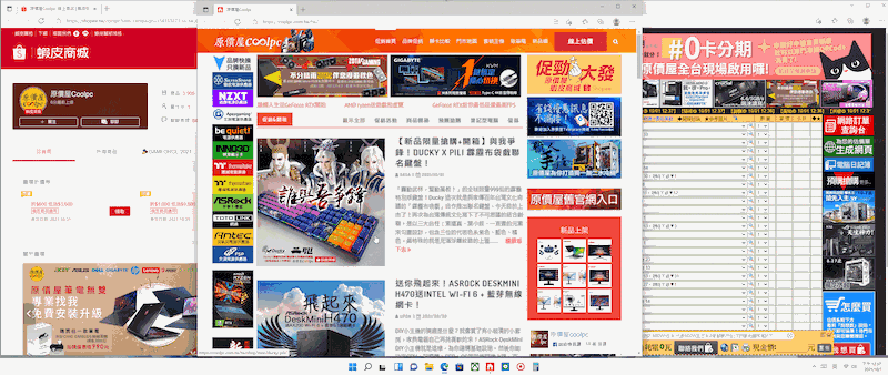 視窗佈局Snap Layouts可以自行選擇將螢幕分割成六種視窗選項,你只要將滑鼠移到應用程式右上角「放到最大」的圖示上就會浮現讓你選擇,選擇後該應用程式就會自動變換到所選的分割視窗中,其他應用程式則是集中在另一側,你可以再次選擇其他應用程式放置於該集的的分割視窗中,如果不想佈局則可以按下ESC退出,或是直接拉開某個分割視窗的應用程式即可。