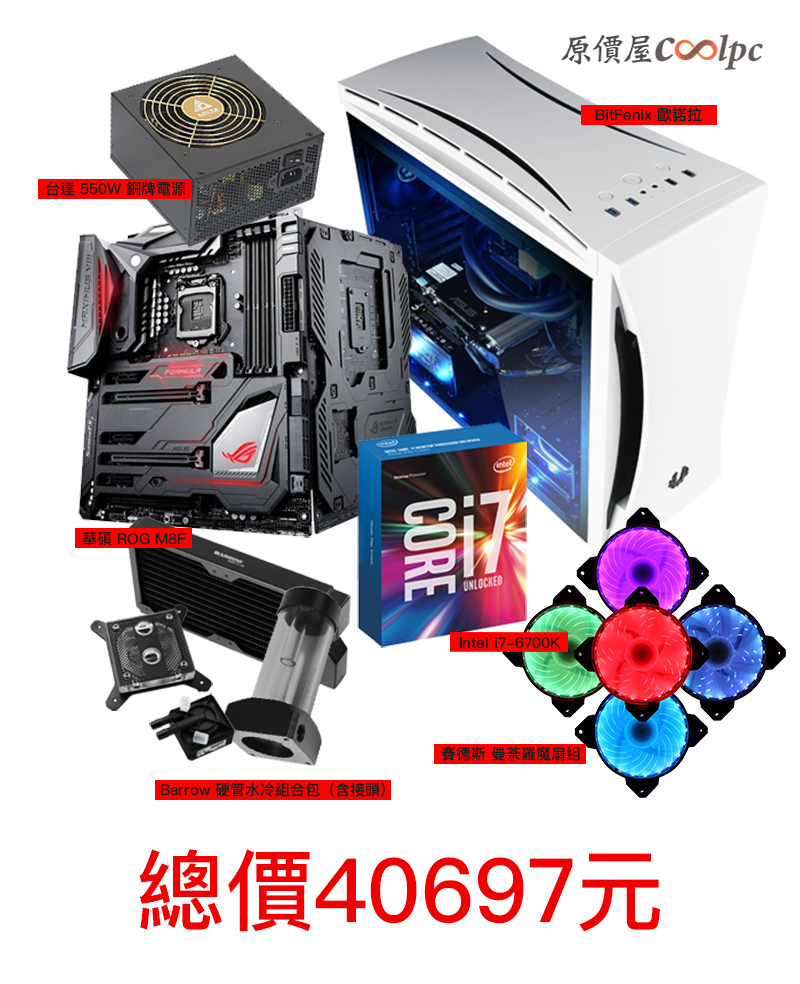 這台代號一柱擎天的原價屋水冷套裝機,在規格上內在特別挑選華碩ROG玩家共和國最高階的Maximus VIII Formula主機板搭配上Intel消費級最高階的i7-6700K第六代處理器,電供部分用上了有著穩定保證的台達550W 80Plus銅牌認證電源!在外觀上,用上了外型相當素雅的BitFenix 歐諾拉白色款,最大的特色在於這款機殼與華碩ROG團隊合作開發的RGB Chroma Control燈光控制器及SSD Chrom炫光燈座,能夠呈現七種顏色及一種情境模式!在水冷以及散熱套件部分,則用上了Barrow品牌套件,不管在水冷頭、水箱、水冷管、水泵以及接頭等等搭配上賽德斯 曼荼羅魔風扇以及專用模組畫線材、RGB燈條、配線盒以及遙控器。整體硬體配置上,都是相當不錯的!以上全部零組件總價加起來超過四萬元,大家可以實際前往原價屋線上估價系統點選看看!只不過,現在來原價屋就只要39900元(含稅)!什麼!你說還有硬碟和記憶體沒有講到?當然開門做生意就不怕,我們沒有講到是因為原價屋要直接送給你,現在只要你成功購買到這一台一柱擎天 原價屋水冷套裝機,價值超過萬元的SSD、記憶體還有現在熱門的鬥陣特攻 典藏版就直接送給你,那最後的顯示卡就留給你自己選擇啦!