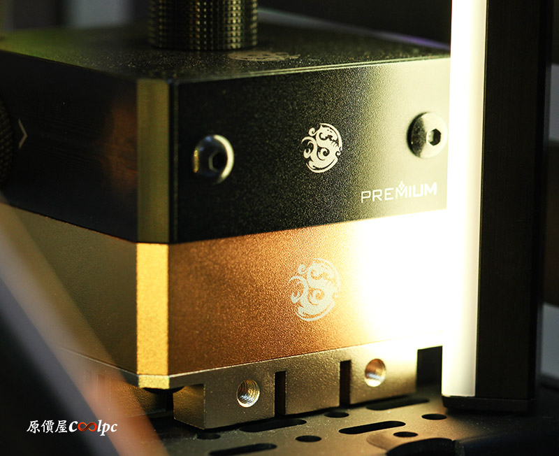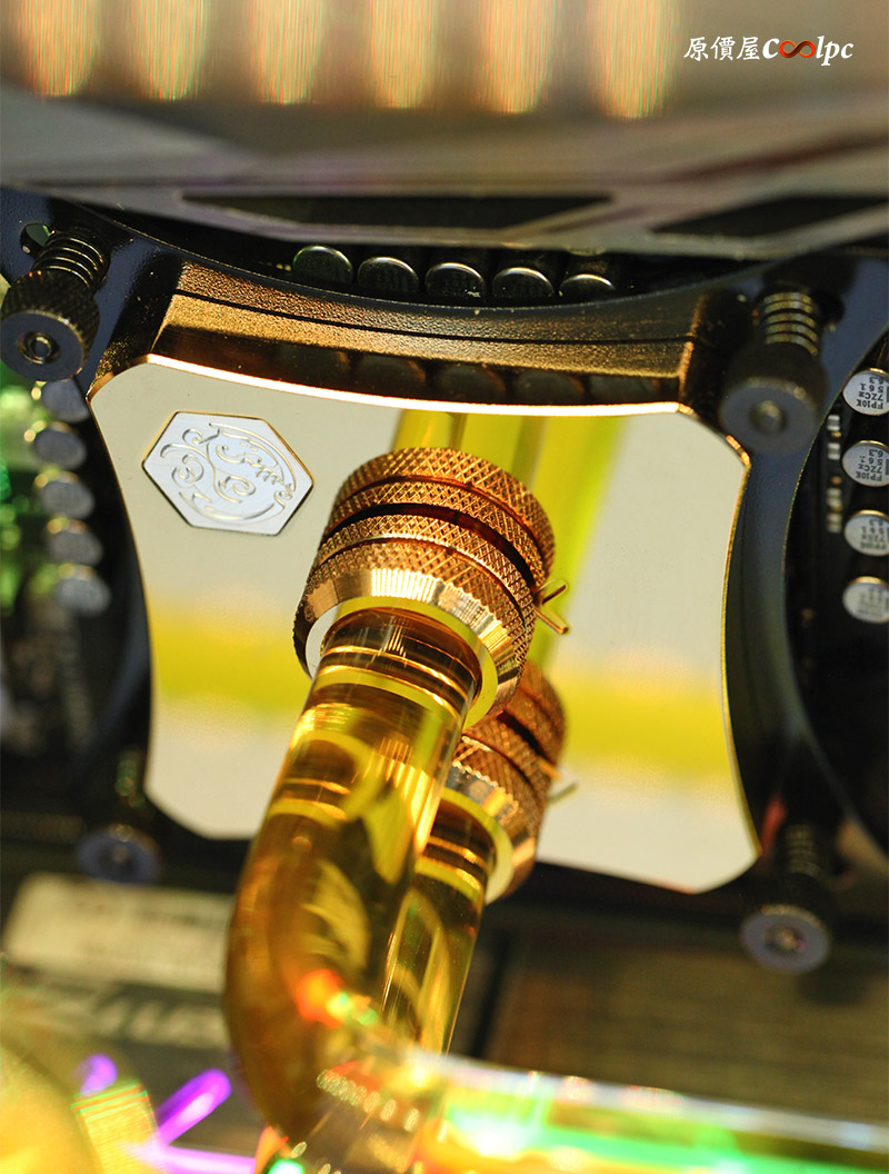 水箱部分也能看到多處有著代表BitsPower品牌的龍圖騰LOGO,職人特別調出的金黃水色,也跟整個水箱做出結合,一體性的色調搭配,讓機殼內部更佳的輝煌!