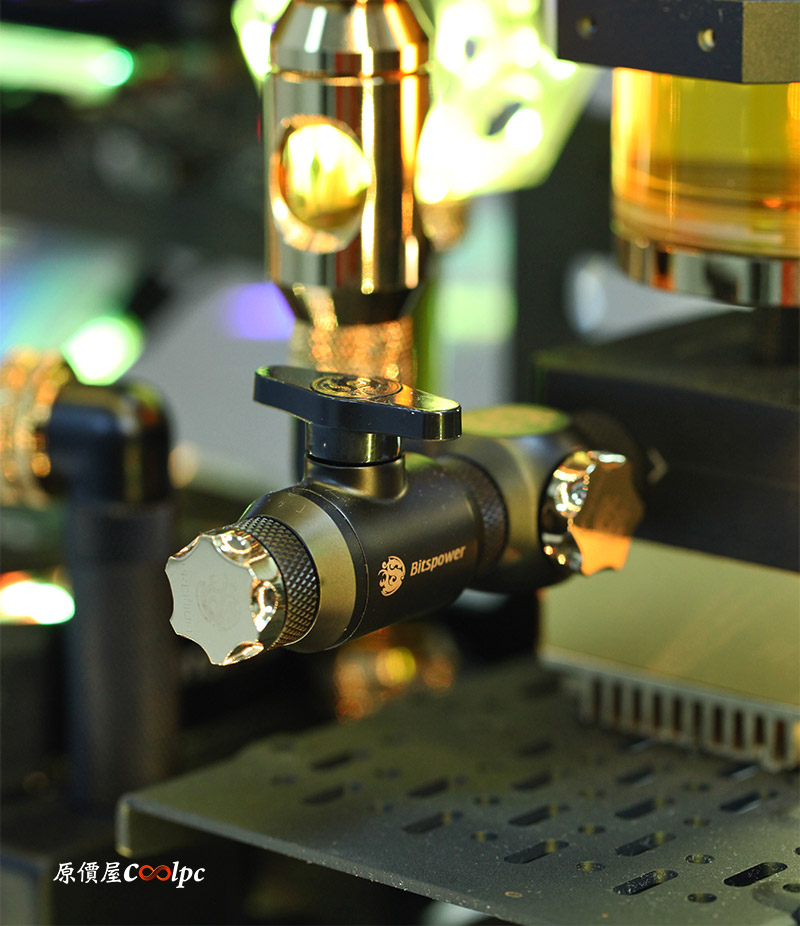 BitsPowe的霧面材質卸水開關質感也是一流,配上金黃色的金屬材質轉頭,只能說職人當初的選擇是對的,想到用這組水冷套件來打造,真的是太match了!