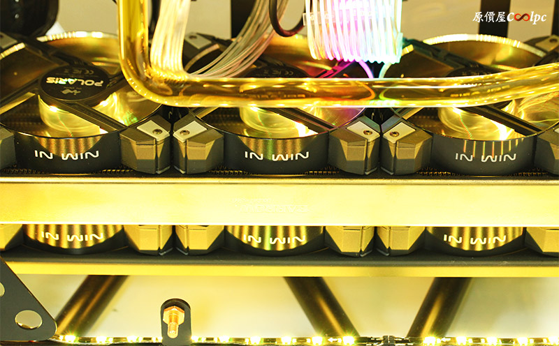 除了配置迎廣的POLARIS RGB 12CM雙風扇組,在側邊,職人為了增強黃金燈光打上去的強烈效果,也特別從原本的黑色,改造成金色來凸顯燈光的呈現。