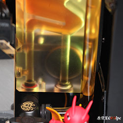 水冷液的顏色選用呼應主題的琥珀色,配合機殼內的燈光看上去就變得有些金黃色,呈現出一種由淺而深的層次感。