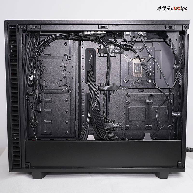 龍大俠這次選用Fractal Design Define 7 TG 黑色鋼化玻璃靜音版機殼,前面板加入客製化立體AORUS 老鷹LOGO,讓他變得更加非常搶眼!而且除了兩側進風孔之外,機殼上方也有許多交叉造型的透風網孔,保持機殼內的風向對流,內部空間運用更是發揮的淋淋盡致!你可以看到前方和上方搭配兩個雙360薄排,單水路的架構設計,水箱出水會先到達顯示卡,再由上方的冷排散熱,將處理過後的水再流入處理器,接著再由前方冷排將水導入水箱循環運作。
