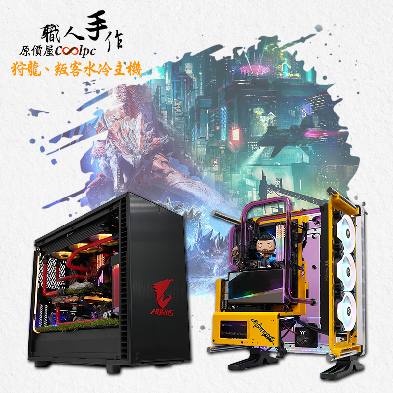 萬眾期待的原價屋職人水冷機來臨啦!這次由我們酷寒大師龍哥一手包辦兩台以電玩當題材的水冷主機!分別為魔物獵人《狩龍》和Cyberpunk 2077《叛客》兩台主機風格大不同!可以看到《狩龍》水冷主機,採用Fractal Desing Define 7機殼內部寬闊的優勢,讓我們龍大師能夠盡情發揮無限的想像力,像是使用草皮、石頭道具以及遊戲中的BOSS模型、鮮明的紅色水冷液和燈光點綴,還原玩家們獵龍行動情境!而《叛客》水冷主機則是曜越DistroCase 350P ARGB超大面積強化玻璃水道板機殼,將部分支架烤成大膽的黃色和紫色水冷液再配上ARGB燈效,展現出霓虹閃爍的不夜城樣貌,真的非常用心設計呢!