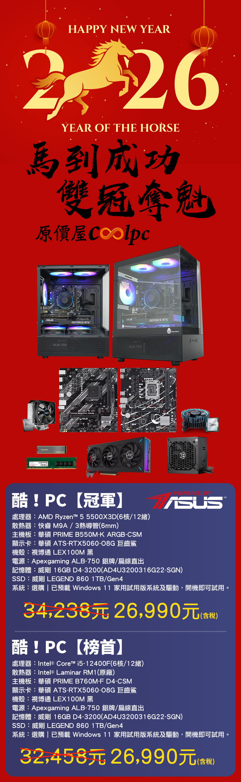 金馬奔騰迎盛世,萬象更新戰旗揚!邁入 2026,原價屋首先祝各位玩家在新的年度「馬到成功」,也預祝各位新年快樂!無論在學業、事業還是遊戲戰場上都能一馬當先!我們特別在開春之際推出「C/P 值雙冠」組合,若您嚮往遊戲戰場上的絕對武力:酷!PC【冠軍】主機就是為您量身打造的奪冠機器,搭載 AMD Ryzen 5 5500X3D,憑藉傳奇的 3D V-Cache 技術助您在激戰中以幀數壓制對手,直取冠軍寶座;若您崇尚的是穩如泰山、各項指標皆奪魁的硬實力,酷!PC【榜首】主機則以 Intel 經典性價比之王 i5-12400F 為基石,兩款主機結合華碩主機板與顯示卡,在 3A 大作與多工任務,甚至是 AI 領域,皆能佔據領先地位、傲視群倫。